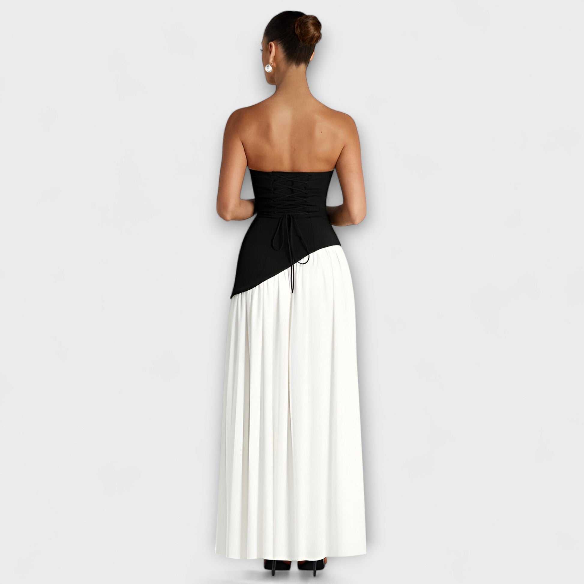 Contrasting Design: The eye-catching black strapless top paired with a flowing white skirt creates a high-fashion look that captures attention and exudes sophistication. Stand out at any event with this stunning combination.